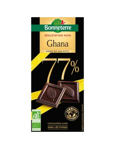 Chocolat Dégustation Noir Ghana 77% Bonneterre, Chocolat avec une forte typicité de goût, « rond et cacaoté » à 77% de cacao. Un nouveaux pourcentage de cacao dans la gamme Bonneterre: afin de déterminer le pourcentage idéal pour cette nouvelle origine.