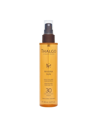 Formule huile sèche non grasse pour le visage & le corps au fini satiné enrichie en algue de Méditerranée boostée en caroténoïdes, qui hydrate, protège et sublime le bronzage.