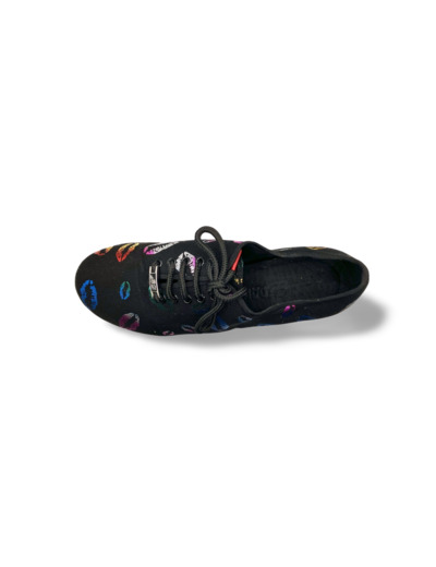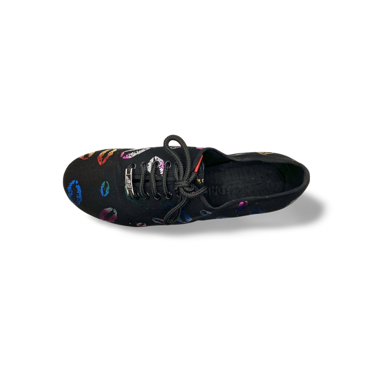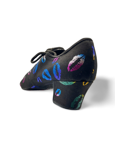 La chaussure T1-B de BD DANCE est parfaite pour les danseurs passionnés, qu'ils soient en apprentissage ou en compétition. Conçue pour les danses latines et standards, elle allie confort, performance et élégance de manière exceptionnelle. Matière toile. Talon de 4,5cm. Motif impression bisous multicolors.