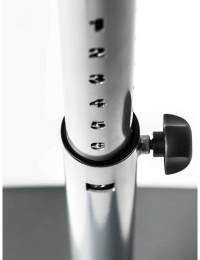 Le modèle Giselle fait partie de notre gamme de barres mobiles professionnelles. Nous proposons deux types de socles en acier : un socle avec deux roulettes pesant 20 kg et un socle plat sans roulettes, pesant 10 kg. Le socle avec roulettes en caoutchouc haute densité offre une stabilité optimale et permet de déplacer la barre sans effort en l'inclinant à 45 degrés.