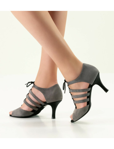 Lydia, la chaussure de danse de Tango/Salsa ouverte en nubuck gris et imprimé Ariel Noir. Une chaussure élégante et assurant un bon maintien avec son lacet montant resserrant les brides sur le dessus de votre pied.