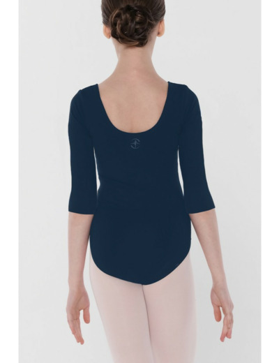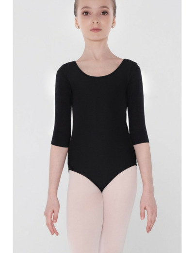 Ce justaucorps classique à manches 3/4 présente un décolleté arrondi et une échancrure modérée au niveau des cuisses. C'est une pièce intemporelle qui confère une silhouette classique.