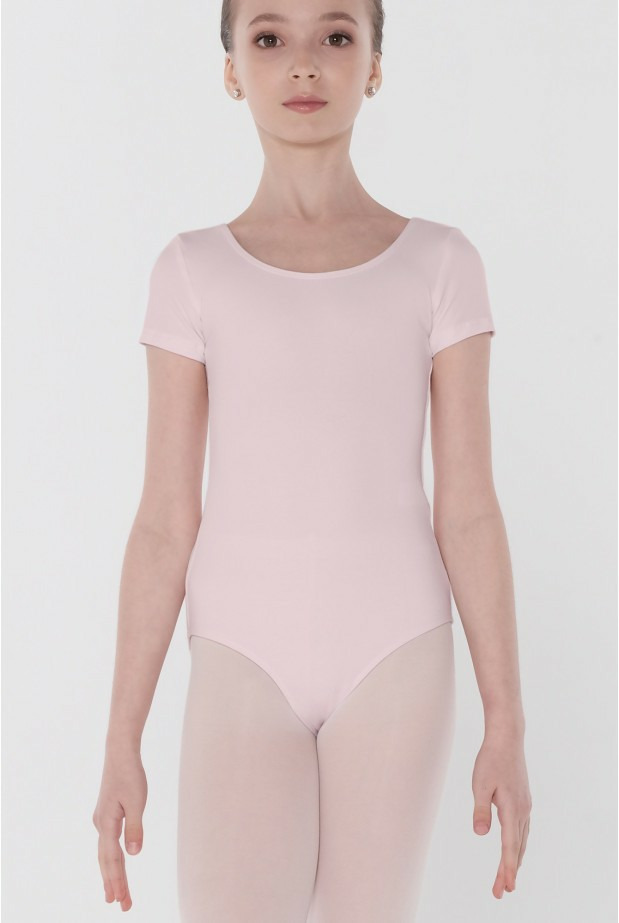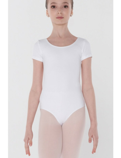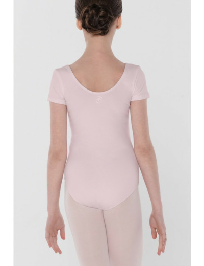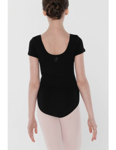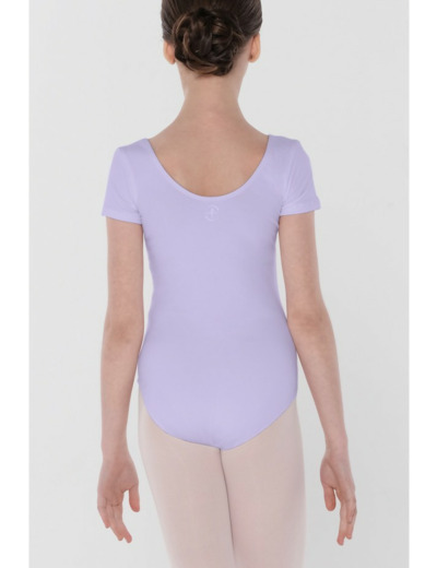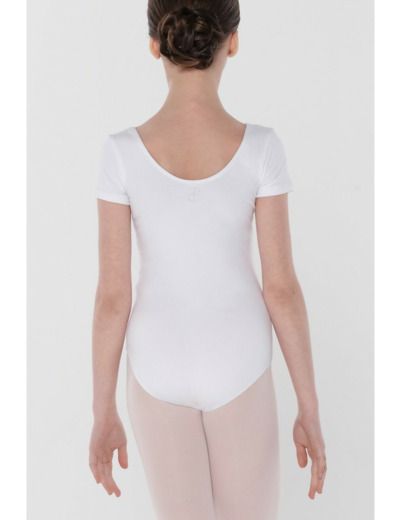 Ce justaucorps classique à manches courtes présente un décolleté arrondi traditionnel à l'avant et à l'arrière, ainsi qu'une échancrure modérée au niveau des cuisses.