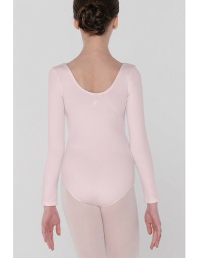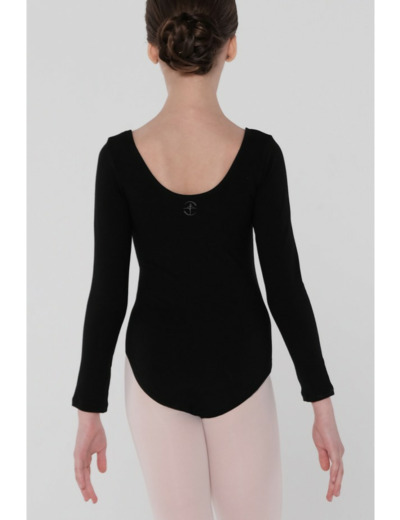 Ce justaucorps classique à manches longues présente un décolleté arrondi à l'avant et à l'arrière, ainsi qu'une échancrure modérée au niveau des cuisses.