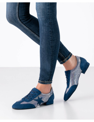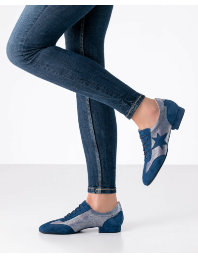 La chaussure de danse Ariana – Werner Kern offre une alliance harmonieuse entre style moderne et confort exceptionnel. Son daim bleu élégant, combiné à un cuir imprimé scintillant, crée un look expressif et raffiné. Une discrète application étoilée vient souligner le caractère dynamique et féminin du modèle, tout en apportant une touche d’originalité subtile.