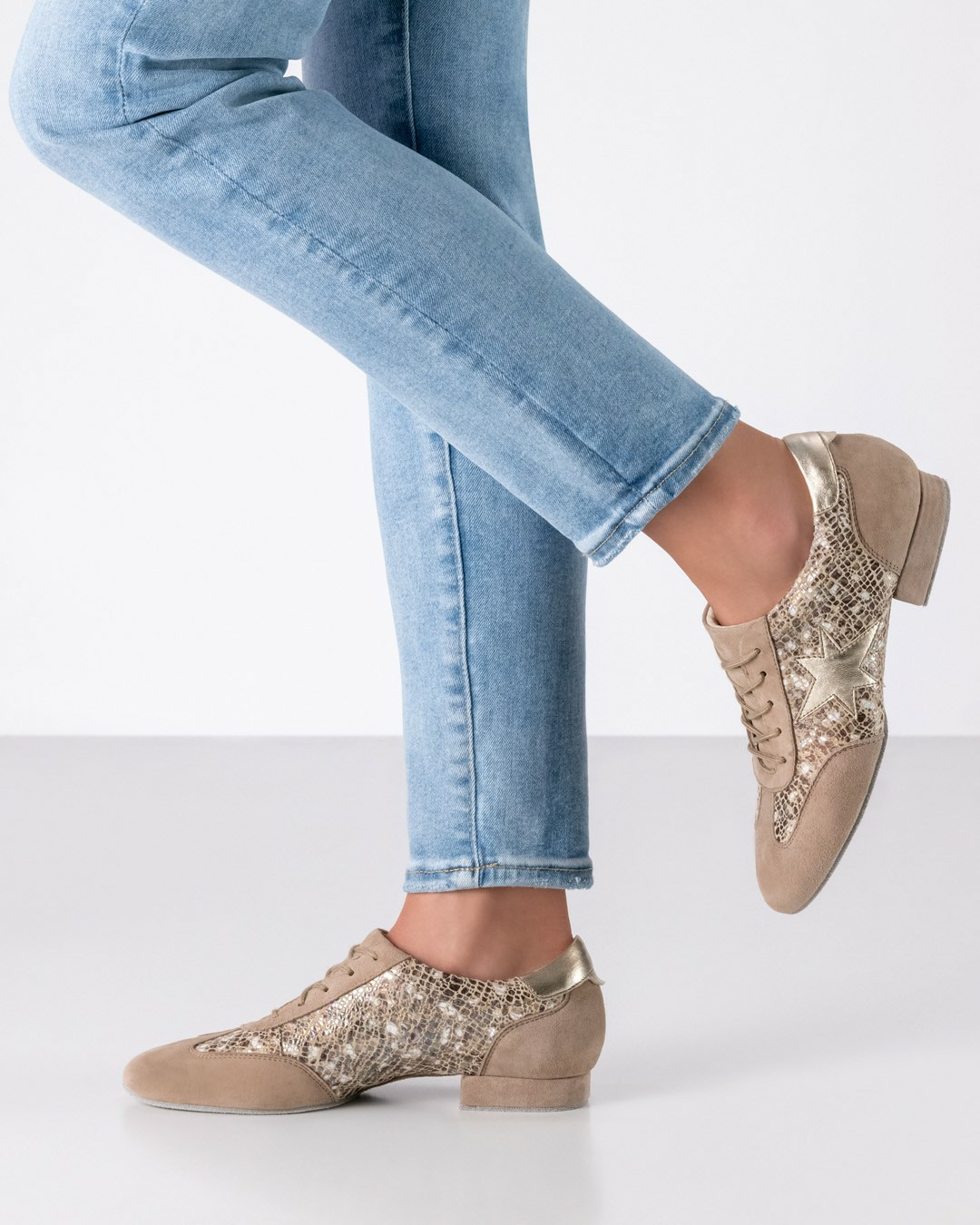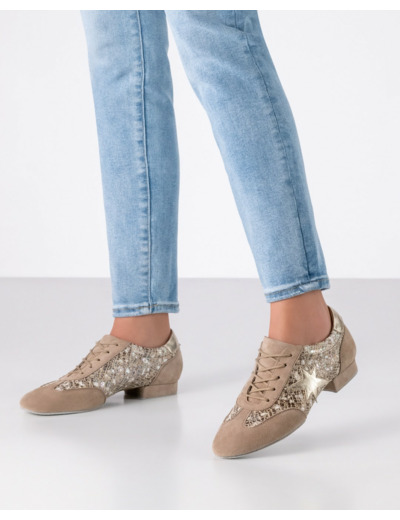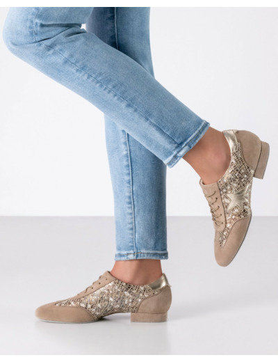 La chaussure d’entraînement Ariana – Werner Kern combine élégance moderne et confort exceptionnel, pensée pour accompagner les danseuses tout au long de leurs séances. Confectionnée en daim beige doux, rehaussé de détails métallisés beige platine, elle offre un style raffiné et discret, parfaitement adapté à un usage intensif.