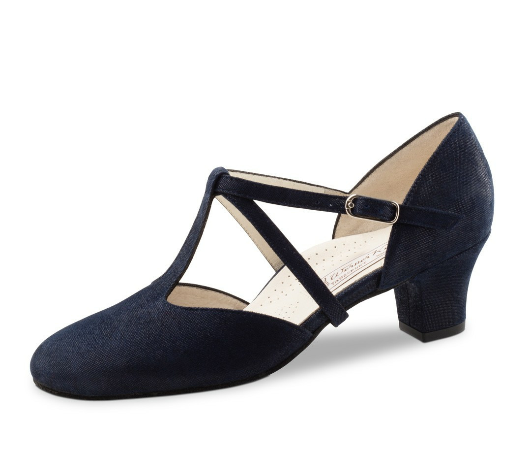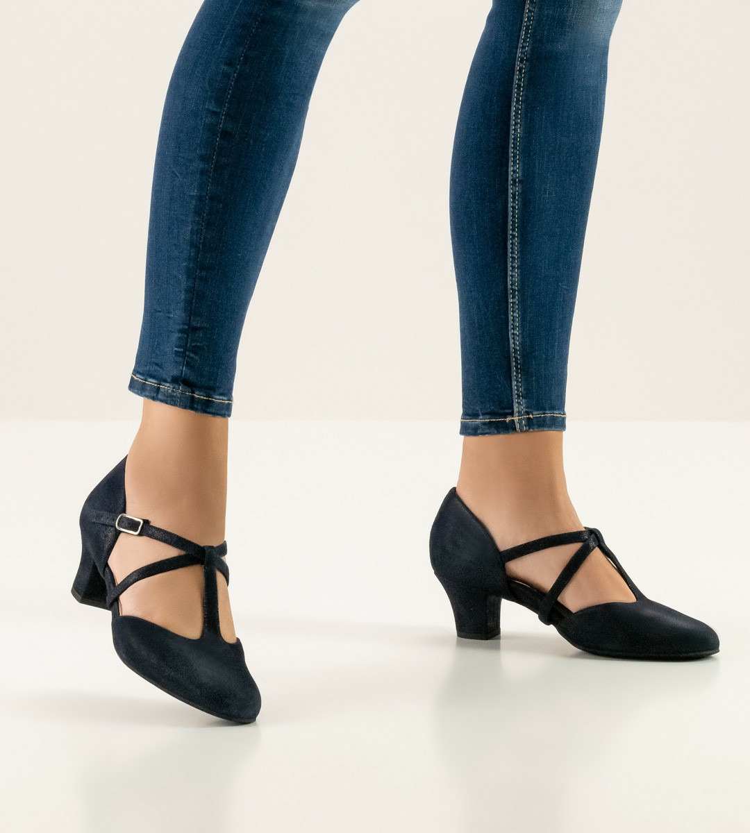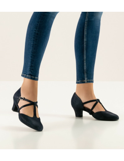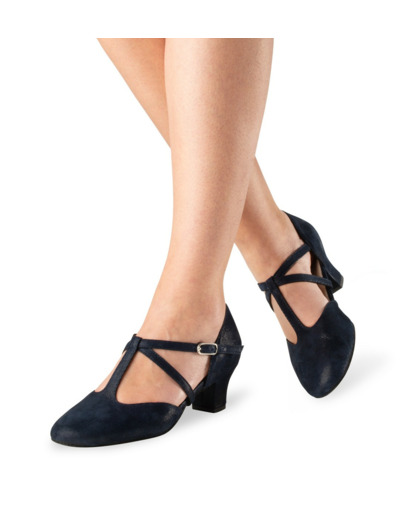 La chaussure Jessie va faire chavirer votre coeur et votre pied. Une sensation de confort et de douceur sera au rendez-vous lorsque vous enfilerez la chaussure grâce à la semelle confort. Ses brides entremêlées et son superbe daim bleu brillant apportent une élégance à la paire. Elle facilitera vos pas de danse grâce à son talon intermédiaire de 4.5 cm offrant une stabilité et sa semelle permettant de maîtriser vos mouvements.