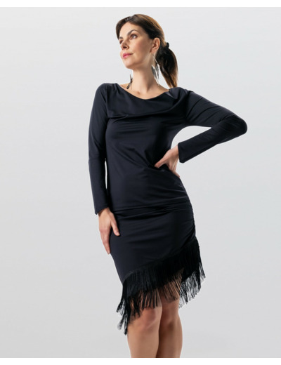 Le tissu noir extensible épouse parfaitement les mouvements du corps et assure un maintien sûr pendant toute la danse. Léger, fluide et agréable à porter, il garantit un confort optimal même lors de séances intenses. L’ourlet en biais, orné de franges, accentue la dynamique du mouvement et apporte une touche féminine et expressive.