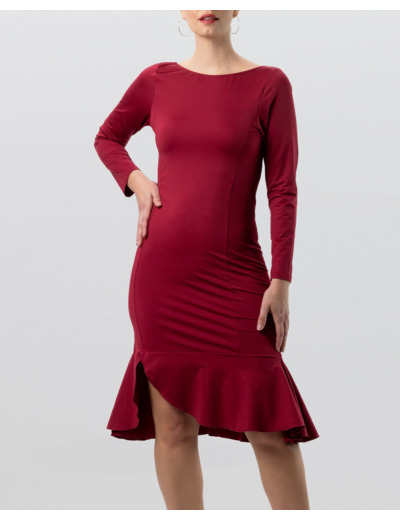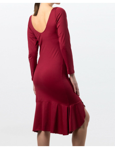 Découvrez la robe de danse Zuri en bordeaux, une pièce élégante et fluide conçue pour sublimer chaque mouvement sur la piste. Sa silhouette féminine près du corps, associée à un ourlet à volants légèrement évasé et une fente latérale, crée un effet dynamique qui accompagne parfaitement les pas de danse, des plus subtils aux plus expressifs.