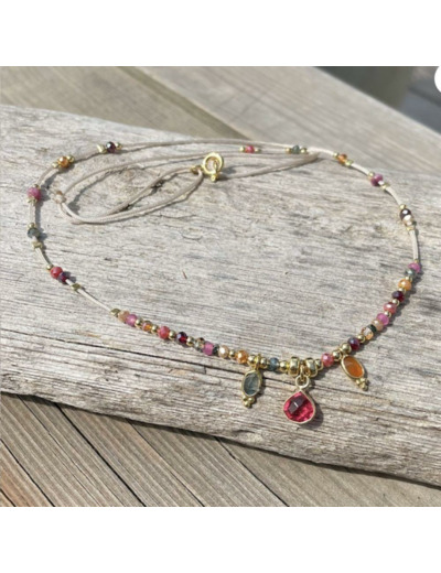 Ce collier délicat est orné d’une Rubellite, pierre fine sertie en Argent 925 plaqué Or, accompagnée de deux petites Citrines et Labradorites, ainsi que de perles de cristal et de perles en Argent 925 plaqué Or.