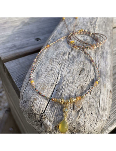 Ce collier raffiné est composé de deux pierres fines en Calcédoine jaune, serties en Argent 925 plaqué Or, accompagnées d’une multitude de perles de cristal, d’hématites et de perles en Argent 925 plaqué Or.