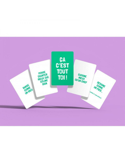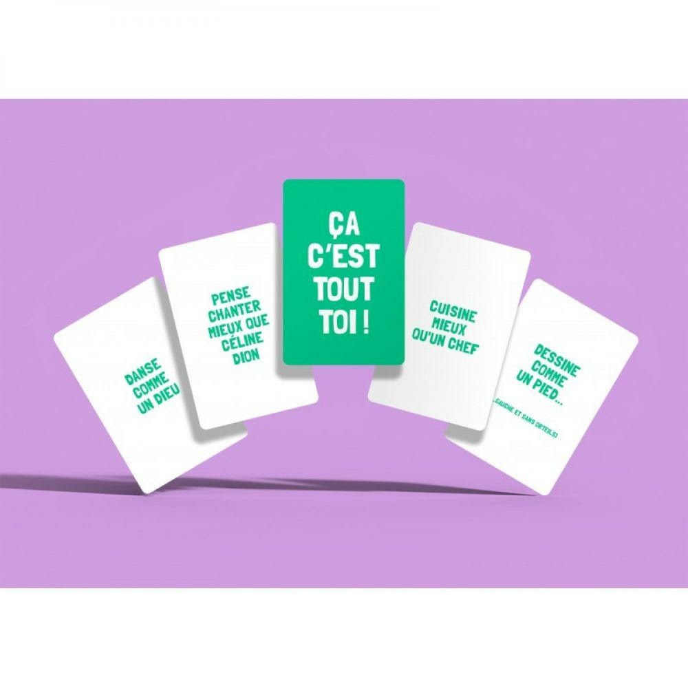 Distribuez 7 cartes à chacun. L'un des joueurs pose la carte "c'est tout toi" devant la cible de son choix. Puis, il choisit une carte de son jeu et la pose, face cachée, devant la cible en disant "ça, c'est tout toi !". Tous les participants déposent ensuite eux aussi une carte de leur jeu, face cachée toujours, devant la cible. Certains vont poser des cartes qui disent la vérité, d'autres vont bluffer ! Dès que la cible pense qu'un joueur ment, elle dit "menteur" et stoppe le tour. Si le joueur qui a posé la carte a effectivement menti, il ramasse malheureusement toutes les cartes de ce tour. S'il a dit la vérité, c'est à la cible de prendre les cartes !