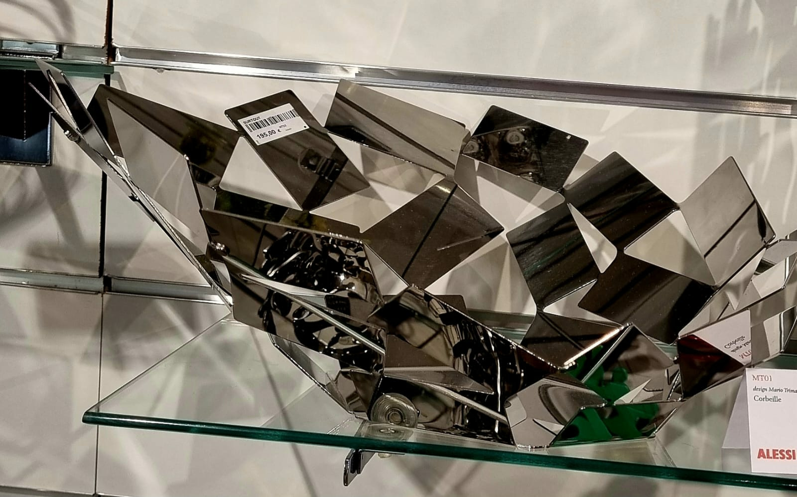 Centre de Table/ corbeille à fruits de la famille « La Stanza dello Scirocco » objets pour la cuisine et le séjour dessinée par Mario Trimarchi, aux formes géométries arythmiques, composés de petits éclats de dimensions différentes, unis entre eux par des points en équilibre instable.