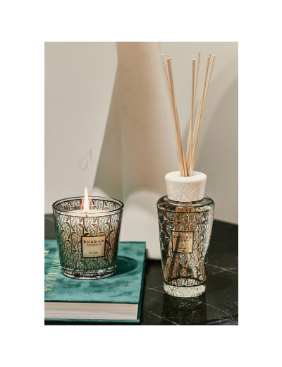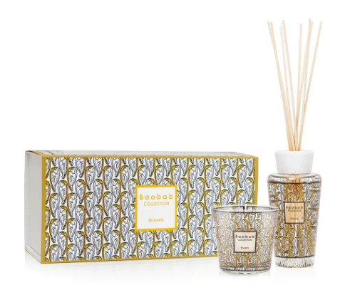 La bougie parfumée et le diffuseur Brussels dans sa sérigraphie noire et or rendent hommage à l'architecture de Victor Horta.