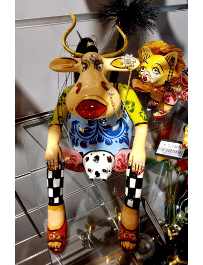 La vache Esmeralda M, la provocatrice, dans son costume fantastique plein d'ornements exotiques et ludiques. Il brille aux couleurs de l'arc-en-ciel et crée une atmosphère joyeuse, comme celle que l'on retrouve dans l'une des chansons préférées de Tom, « What a Wonderful World ».