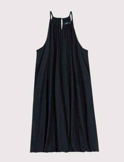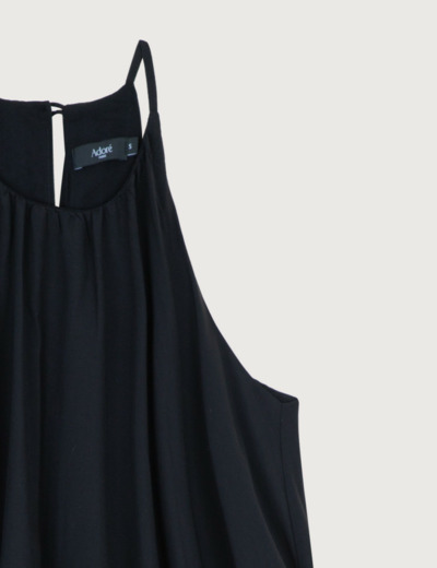 Robe courte en Tencel de couleur Noir, sans manches, avec fermeture à la nuque par un bouton. Elle présente un col rond, un bas de robe resserré par des élastiques pour une forme ajustée, une doublure pour plus de confort, et deux poches discrètes sur les côtés.