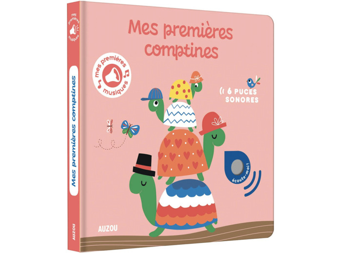 Un livre sonore joliment illustré pour découvrir et chanter ses premières comptines, avec des textes courts, facile à mémoriser, comme “La famille tortue” ou Pomme de reinette"