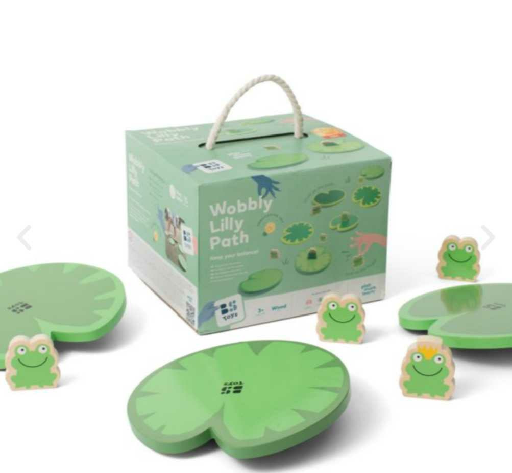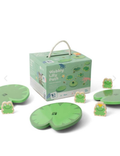 Jeu tout en bois "le chemin bancal", sautez comme des grenouilles de nénuphars en nénuphars. Tout en bois, les nénuphars ne sont pas stables et vous obligent à bien maîtriser vos mouvements et vos gestes.