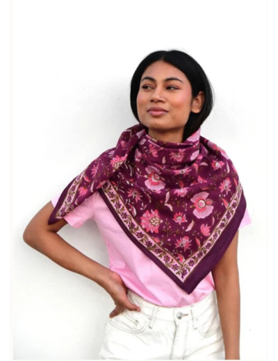 Avec son imprimé délicat, son camaïeu de prune et rose, il égayera vos tenues et réhaussera votre teint !