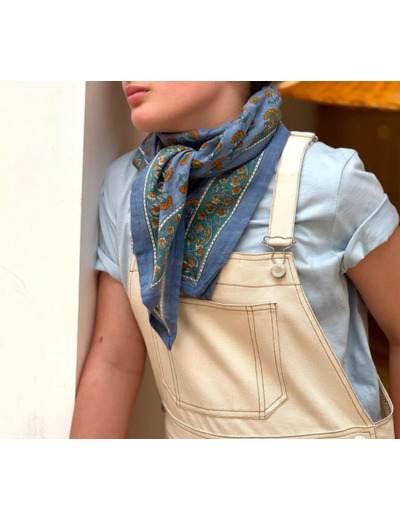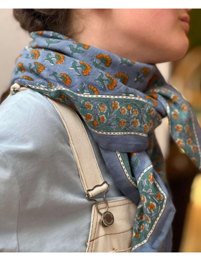 Des petites fleurs teintées d'orange et vert sur un fond bleu moyen lumineux. Le grand foulard Séléné Bleu horizon flatte l'oeil.