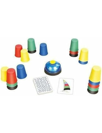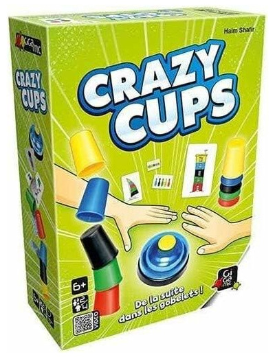 Description du jeu : dans Crazy Cups, chaque joueur reçoit cinq gobelets en cinq couleurs. A chaque début de tour, une carte combinant cinq éléments reprenant les mêmes couleurs que les gobelets est révélée. Les joueurs doivent alors aligner ou empiler rapidement leurs gobelets afin de reproduire exactement la même disposition que celle des éléments de la carte. Attention, il est important de bien suivre l’ordre et le sens des couleurs ! Dès qu’un joueur a terminé, il appuie vite sur la sonnette. Le plus rapide à réaliser correctement sa série remporte la carte en jeu et c’est reparti pour un tour. Restez bien attentifs et ne perdez pas de vue votre objectif car pour gagner à Crazy Cups, il faut avoir de la suite dans les gobelets !