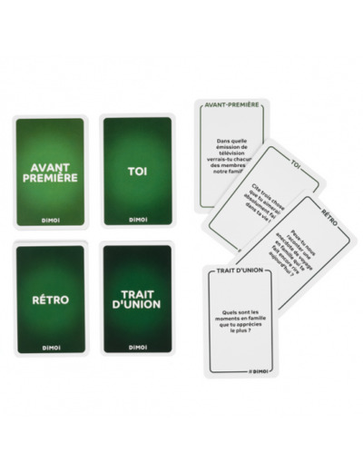Dimoi Édition Famille est un jeu de cartes dans lequel les questions ont pour but d'échanger et se redécouvrir en famille. Faites grandir vos liens familiaux grâce à ces questions soigneusement sélectionnées.