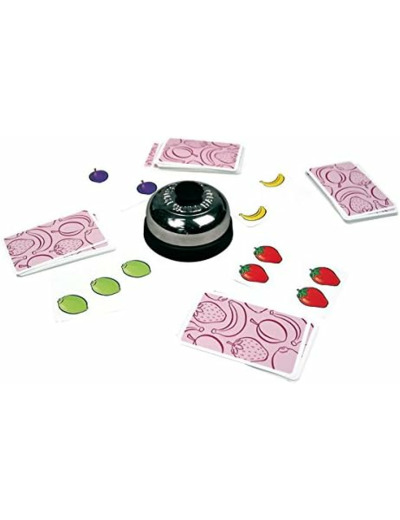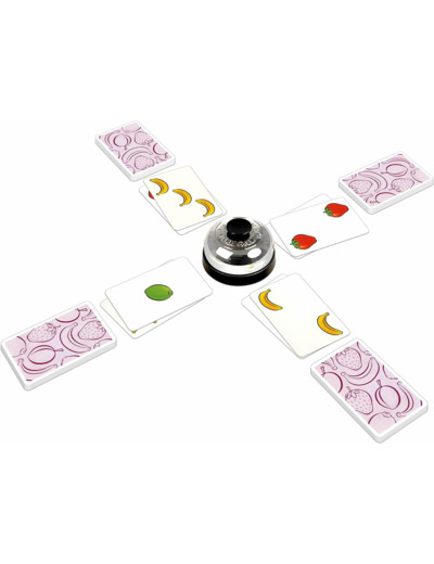 Description du jeu : les cartes sont réparties entre les joueurs et c'est à qui réussira à toutes les récupérer ! Les joueurs retournent une carte à tour de rôle. Dès qu'il y a 5 fruits identiques sur l'ensemble des cartes visibles, le premier qui sonne la cloche gagne les cartes retournées.