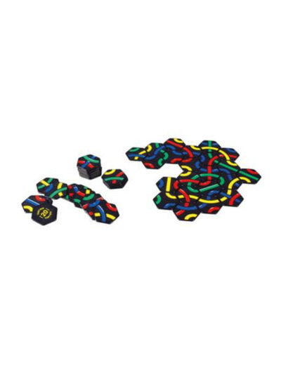 Les tuiles hexagonales de Tantrix ont chacune trois lignes de couleurs différentes qu'il faut juxtaposer en respectant la connexion des couleurs entre elles.