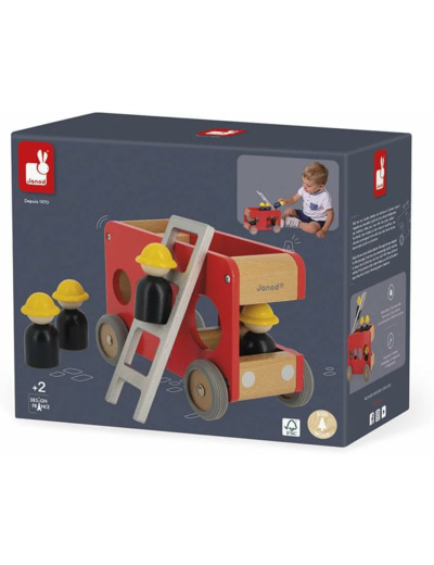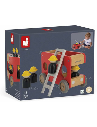 Tous en voiture, nous devons aller sauver un chat coincé dans un arbre ! Ce grand camion de pompiers rouge en bois massif est équipé d'une clochette pour signaler les interventions d'urgence. Destiné aux tout-petits dès 2 ans, ce camion est accompagné de 4 pompiers et d'une échelle amovible pour permettre aux enfants d'imaginer les histoires les plus incroyables et créer leur propre univers comme les plus grands ! Pour plus de facilité, votre enfant pourra installer les petits personnages soit dans le camion soit au-dessus avec la grande échelle. Ses grandes dimensions (22,5 cm de long et 15 cm de haut) et ses roues silencieuses en caoutchouc en font un jouet parfaitement adapté aux petites mains. Les plus jeunes pourront ainsi développer leur motricité fine tout en s'amusant. Dans quelle pièce votre enfant s'amusera le plus avec ce beau jouet ? Ce jouet est fabriqué en bois certifié FSC® et peint à l'eau.