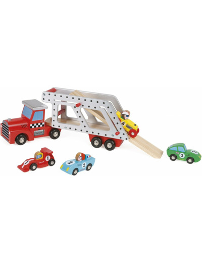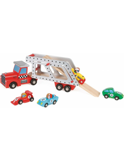 Un véhicule qui transporte d'autres véhicules : c'est toujours impressionnant pour les petits d'apercevoir ce genre de camion sur la route lors d'une balade. En voici un plus petit qui fera le bonheur des fans de voitures et de bolides en tous genres ! Avec sa rampe facile à manipuler, ce camion en bois peut accueillir deux voitures de courses sur chaque niveaux, soit 4 voitures (1 Formule 1 rouge, 1 Speed bleue, 1 Roadster verte et 1 Retromotor jaune) à transporter sur le camion ou pour jouer séparément. Pour que la rampe glisse vers l'arrière du camion et que la porte s'ouvre, il suffit de tirer sur les petites poignées rouges. Ce joli camion fera la joie des passionnés de véhicules qui débordent d'imagination.