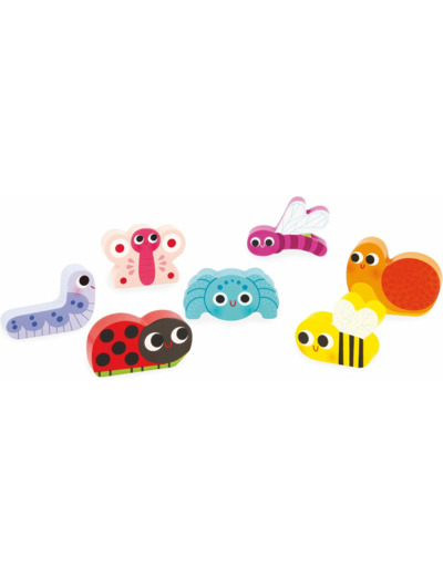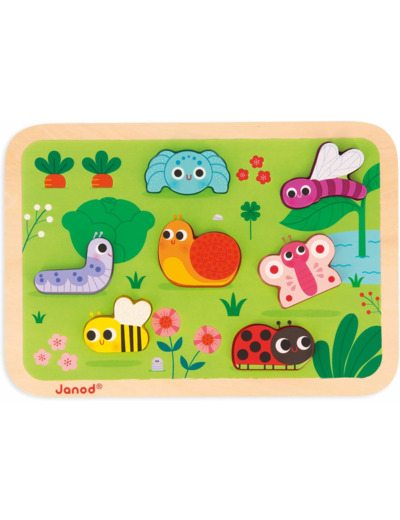 En avant les jardiniers en herbe ! Découvrez notre puzzle en bois sur le thème du jardin, conçu pour les bébés dès 18 mois. Ce jouet d'éveil se compose de 7 pièces épaisses, facilitant ainsi leur préhension par les petites mains. Chaque pièce du puzzle est soigneusement conçue pour représenter une petite bête du jardin : escargot, abeille, papillon, coccinelle, chenille, araignée et libellule. Et ce n’est pas tout ! Ces pièces peuvent également être utilisées comme figurines pour prolonger le jeu et stimuler l’imagination de votre enfant. Ce puzzle en bois est plus qu’un simple jeu, c’est un outil pédagogique qui aide à développer la motricité fine de bébé. En manipulant et en encastrant les pièces, votre enfant renforce sa dextérité et sa concentration. C'est un jouet premier âge idéal comme première approche pour apprendre le nom des habitants du jardin, que bébé découvrira en grandissant et en explorant. En jouant avec les pièces et en les encastrant sur le support, bébé développe sa capacité de préhension. Un puzzle en bois est aussi un chouette moyen de stimuler l'esprit logique ! Proposez ce joli puzzle pour bébé au moment des repas, pour le faire patienter, ou pour une activité calme après la sieste. Quelle drôle de petite bête sera sa préférée ? Puzzle en bois FSC™ et peinture à l'eau.
