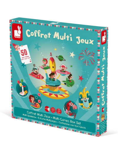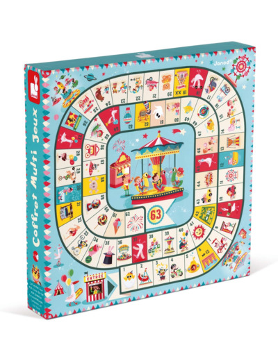 Pourquoi choisir quand on peut avoir 6 jeux en un ? Avec ce coffret de jeux traditionnels, les enfants à partir de 5 ans vont pouvoir redécouvrir de nombreux jeux classiques revisités aux couleurs de la fête foraine ! Jeux de société indémodables, connus par toutes les générations, ces classiques vont ravir tous les joueurs dans une ambiance joyeuse et colorée ! Vous retrouverez dans ce coffret : un jeu de l'oie, un jeu de petits chevaux, un jeu de dames, un nain jaune, un jeu de 7 familles et un jeu de 54 cartes. Du jeu de parcours où il faudra éviter les pièges au jeu de stratégie, ce coffret permettra de satisfaire tous les goûts ! Les pions du jeu de l'oie, des dames, des petits chevaux et les dés sont en bois. En fonction du jeu choisi, vous pourrez jouer de 2 à 6 joueurs. Le plateau du jeu de l'oie et des petits chevaux sont situés directement sur la boite.