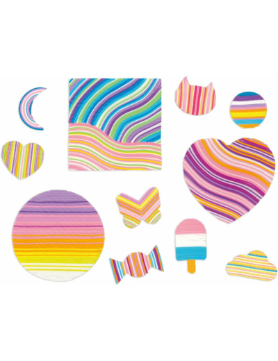 Vous connaissez forcément les scoubidous, mais les avez-vous déjà utilisés pour créer des objets déco ? Avec ce kit créatif, les enfants à partir de 8 ans et même les plus grands peuvent réaliser 11 créations acidulées ! D'abord, 3 tableaux sur lesquels les fils se collent pour former des paysages toujours plus colorés. Créez des ondulations, des dégradés ... Ensuite, 8 stickers de différentes formes à décorer que les enfants peuvent offrir ou conserver comme un trésor. Ce coffret créatif scoubidous contient : 3 tableaux autocollants, 1 planche de 8 stickers, 60 fils de scoubidous (10 couleurs différentes). Un livret avec modèles et instructions est également inclus, pour réaliser ses décos scoubidous comme un pro ! Grâce à cette activité manuelle, les enfants développent leur dextérité et leur minutie tout en exprimant leur créativité. C'est un loisir créatif plein de peps, à offrir pour l'anniversaire d'un fou de scoubidous ! Au total, cette activité nécessite 5h de création (il faudra compter environ 1h par tableau et 15 minutes par stickers). La variété des créations proposées permet de satisfaire les plus impatients comme les plus minutieux !