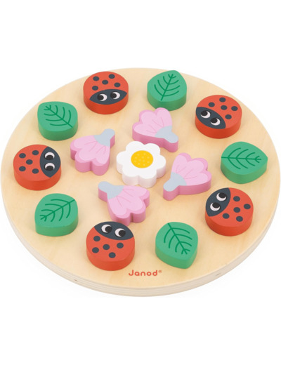 Bienvenue dans mon jardin ! Avec ce jeu éducatif bucolique, les enfants dès 2 ans développent leur imagination et leur sens de l'observation, tout en s'amusant. 2 modes de jeu s'offrent à eux, pour un équilibre parfait entre concentration et inventivité. Le premier mode de jeu consiste à placer les différents éléments sur le support en suivant un modèle : il faut alors bien observer, se concentrer et apprendre à repérer l'emplacement de chaque pièce par rapport aux autres. Le second mode de jeu invite l'adulte à décrire oralement le modèle proposé, l'enfant doit alors lui-même identifier l'emplacement des pièces sur le mandala. Vous pouvez donc proposer aux enfants un jeu éducatif se jouant en autonomie ou en duo, pour toujours s'adapter à leur rythme de progression. Et une fois la phase d'apprentissage terminée, place au jeu ! Laissez votre bambin créer son petit jardin et agencer les éléments comme il le souhaite. Ce jeu en bois se compose de : 1 plateau en bois, 5 abeilles, 5 fleurs roses, 5 marguerites, 5 feuilles, 5 coccinelles et 12 modèles. Idéal pour accompagner le développement de l'imagination et du sens de l'observation des petits, ce jeu éducatif propose une immersion dans le monde curieux du jardin. Il est composé de bois et de carton certifié FSC™. Ce premier mandala fait partie de la gamme pédagogique Janod, développée en collaboration avec une professeure des écoles afin de coller au mieux aux apprentissages et aux programmes de chaque niveau.