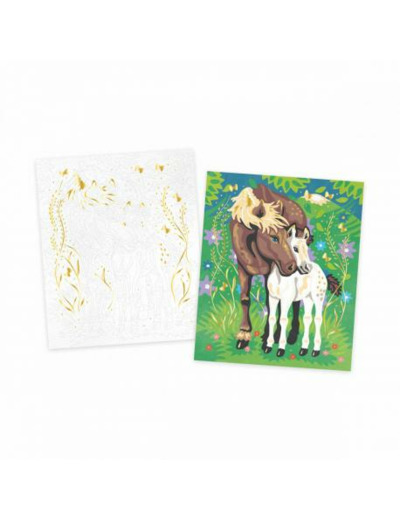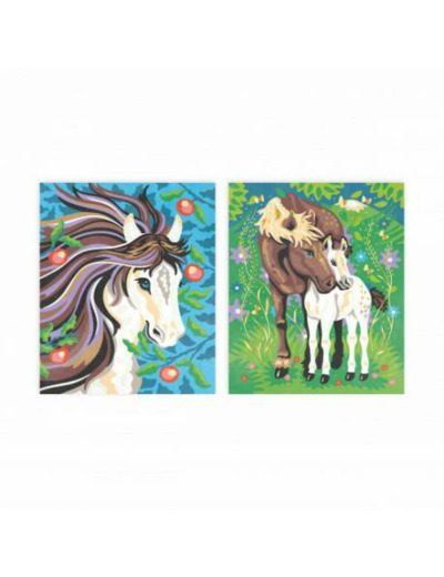 On retrouve une jument et son poulain sur le premier tableau et un joli cheval sur le second. Malin, on profite également d'un cadre que l'on peut peindre pour le personnaliser et l'assortir à ses tableaux . Une palette de 15 peintures aquarelles, une éponge et un pinceau à réservoir d'eau font de ce coffret une activité originale et complète. Un livret explicatif indique la correspondance couleur de chacun des numéros. L'un des deux tableaux a des effets de dorures pour embellir encore plus les créations. Autre bonne idée, la boite se transforme en chevalet pour faciliter l'activité ! Avec ce kit d'activité manuelle, les enfants développeront leur motricité fine et leur patience. Il s'amuseront environ 3h par tableau.