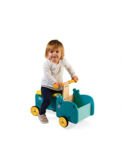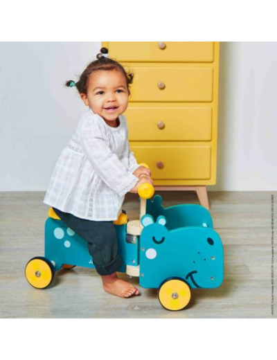 Il va petit à petit apprendre à mieux gérer ses appuis tout en découvrant le monde qui l’entoure. Pratique, la tête de l'hippo est un petit casier qui lui permettra d’emmener jouets et doudous partout avec lui. Le plus de ce porteur ? C'est son look très original ! Notre bel animal et son large sourire donneront envie aux petits de partir à l'aventure. La longue assise en mousse, recouverte d'un revêtement imitation cuir jaune est très confortable. Les poignées en silicone et les roues sont assorties à cette dernière car pour sortir avec style, on ne laisse rien au hasard ! Les poignées à texturées assurent une préhension optimale pour les petites mains des enfants. Enfin, avec ses 4 roues silencieuses en caoutchouc, ce porteur en bois ne marque pas le sol et assure un bon maintien en toute sécurité !