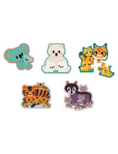 Par exemple, le puzzle 2 pièces montre la maman koala et son bébé, sur le puzzle 4 pièces, on retrouvera la maman lynx et ses 3 petits. De plus, un contour de couleur facilite la reconnaissance des différentes pièces. Les puzzles sont composés de 2, 3, 4, 5 et 6 pièces et imprimés avec des encres végétales. Cet ensemble de puzzles est fabriqué en France. Jouet développé en collaboration avec WWF®. Janod soutient les efforts du WWF® pour protéger l’environnement et la biodiversité grâce à une nouvelle gamme de jouets fabriqués à partir de matériaux plus durables. À travers cette gamme, nous visons à inspirer et à permettre à la jeune génération de se mobiliser pour la faune et la nature.