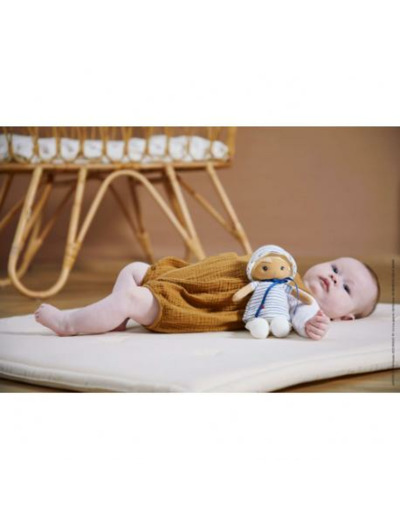 Facilement reconnaissable grâce à sa chevelure blonde et ses rayures contrastées, Eli est facile à saisir par les petites mains. Élégante, avec son petit look de marin, la poupée Eli est composée de micro-velours très doux et de mousseline de coton. Le rembourrage présent à l'intérieur de cette poupée pour bébé est en polyester recyclé certifié GRS. Lavable en machine en cycle doux, cette poupée doudou est du plus bel effet dans sa boîte. Idéale pour un cadeau de naissance ou pour offrir l'ami(e) d'une vie à bébé.