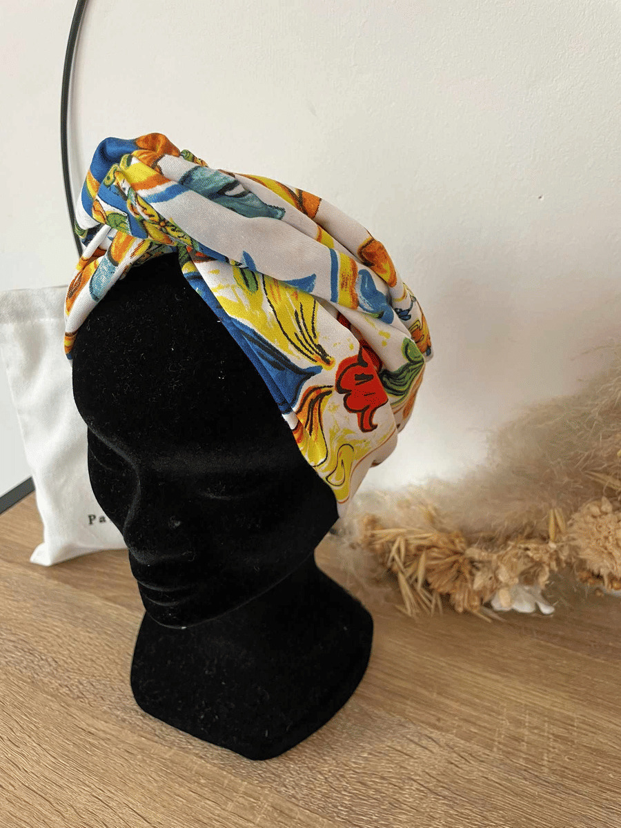 La marque Paloma Germain milite depuis sa création pour associer solidement le monde de la mode avec le talent local. Ses turbans sont fabriqués en France , selon un processus éco responsable basé sur un travail à façon réalisé à la main avec des matières issues du second circuit de production des maisons de luxe françaises.