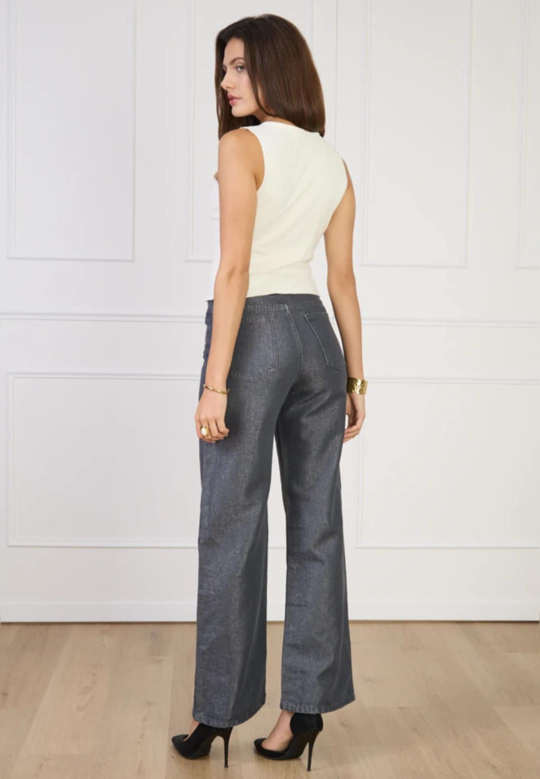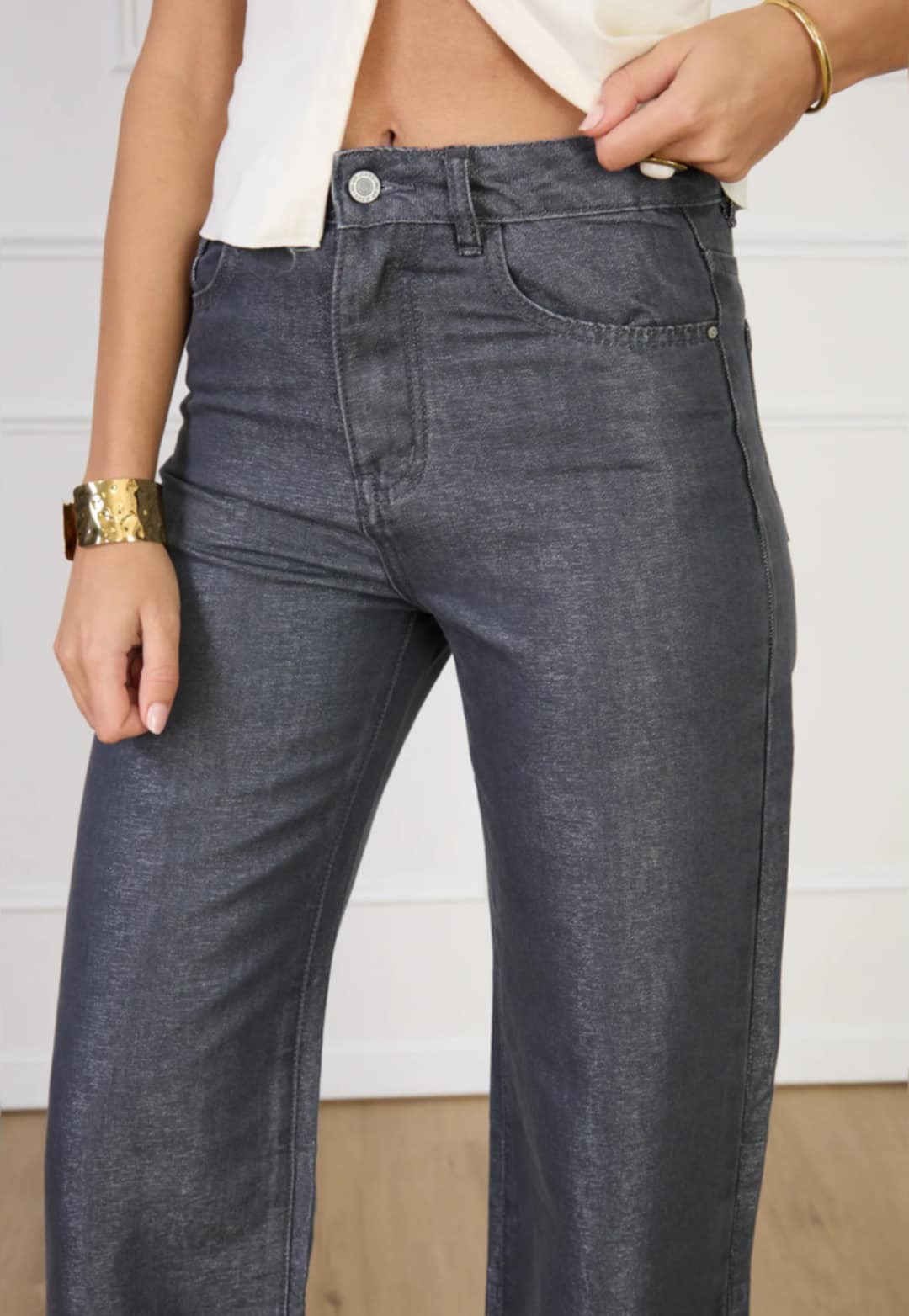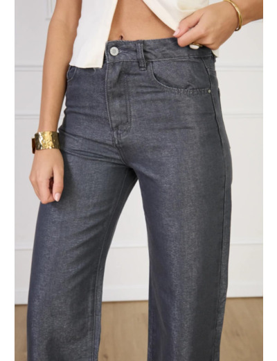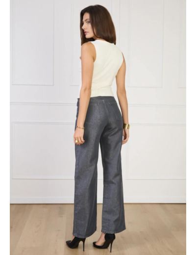 Jean bleu/gris coupe droite avec lurex et effet métallisé.