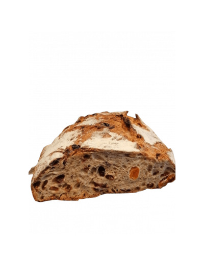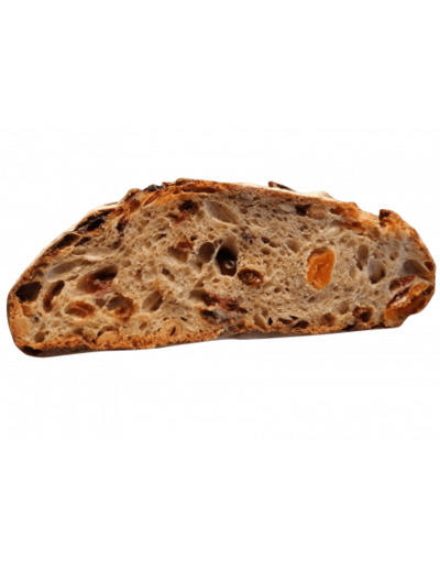 Pain artisanal au poids non coupé. Grâce à sa composition très fruité, ce pain est idéal pour le petit déjeuner, le gouter. Mie légèrement bis, riche en abricots, noisettes entières, cramberries, graines de courge, raisins.