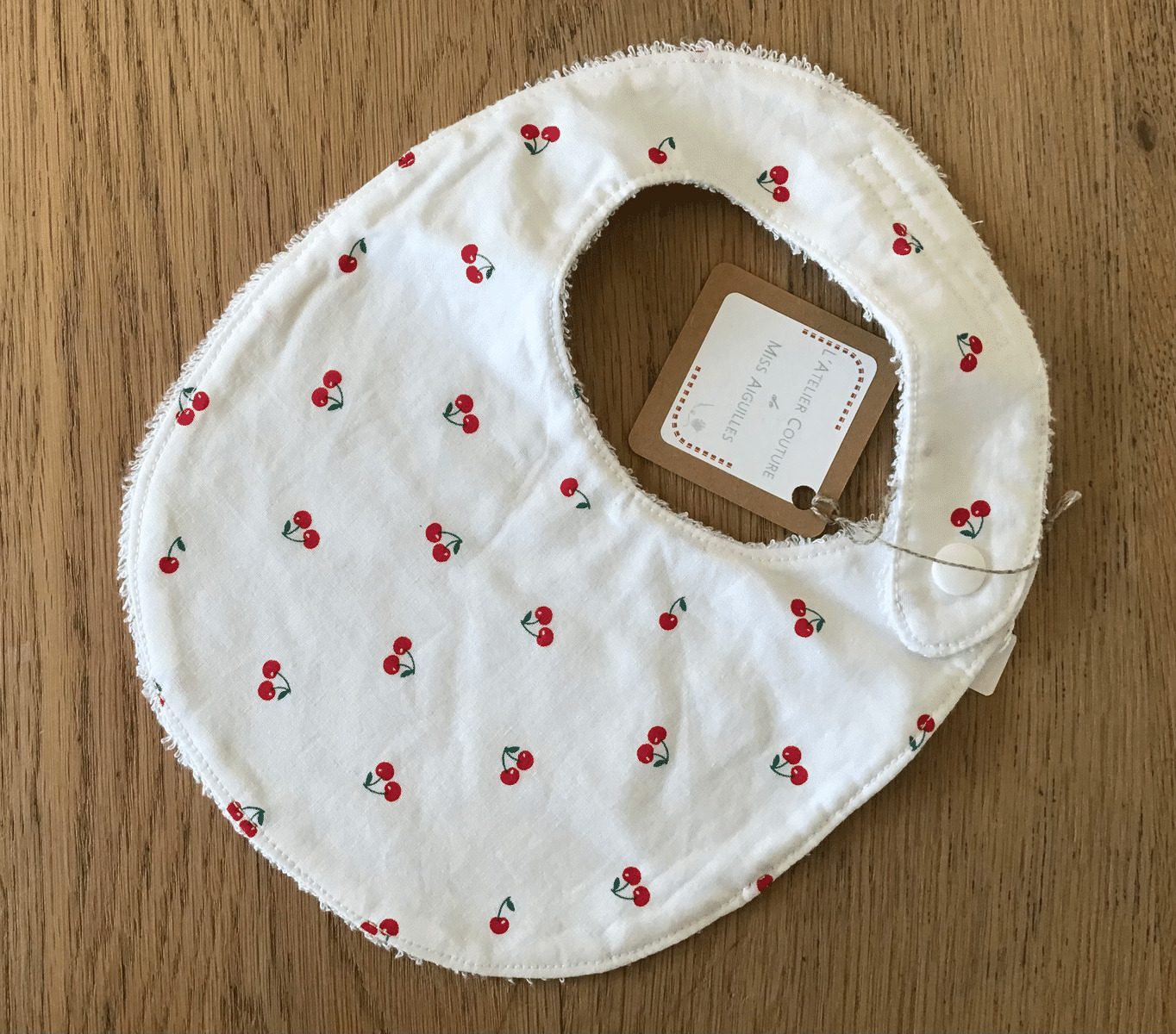 Bavoir rond grand format . Éponge de bambou pour l’absorption et tissu coton petites cerises .