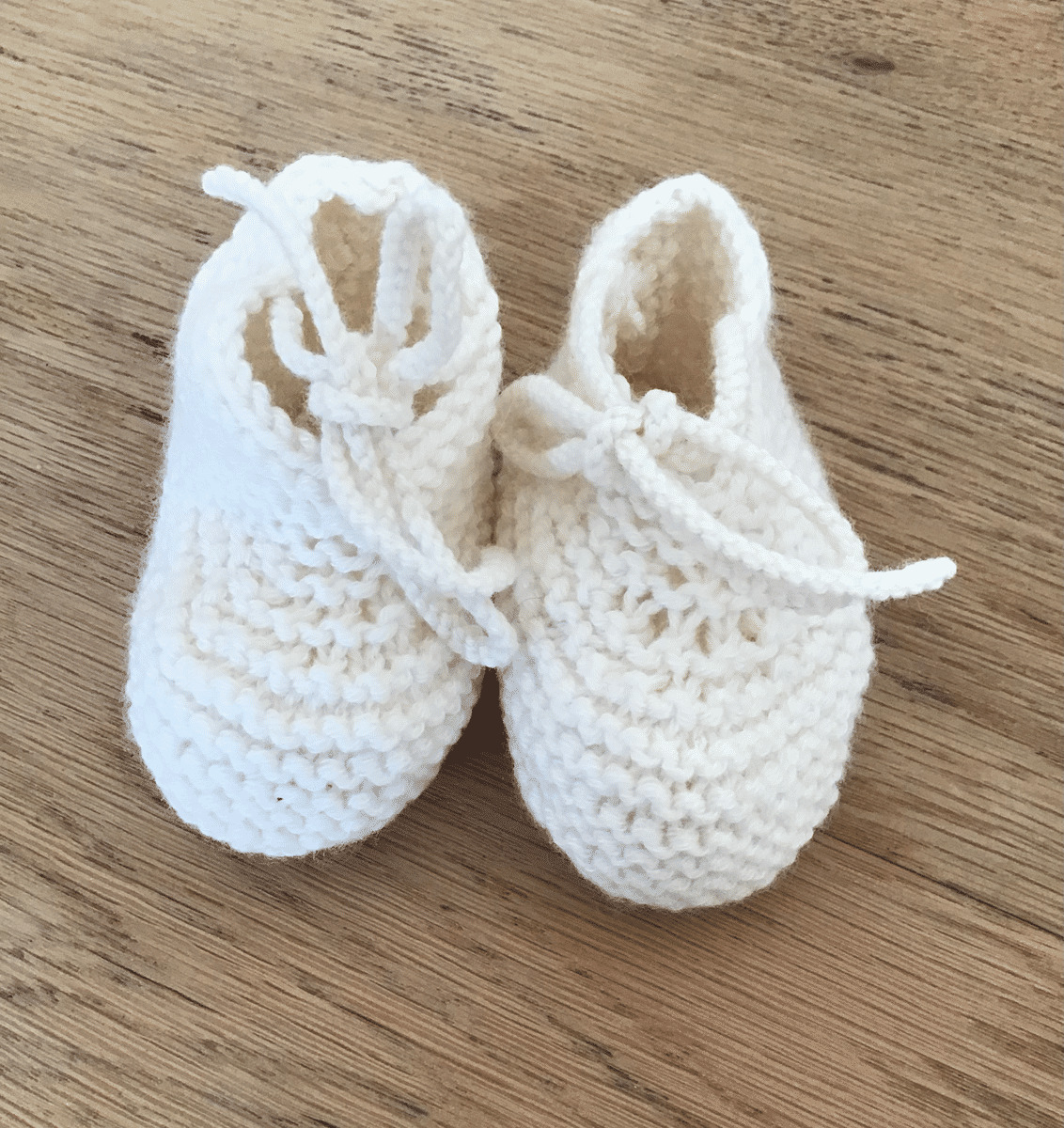 Chaussons bébé , avec petits noeuds, en pure laine blanche. Ils sont tricotés à la main, au point mousse, avec une laine de qualité, pour être bien au chaud.