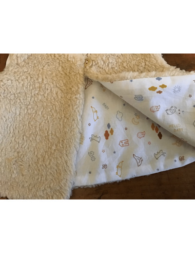 Gilet berger réversible, une face fausse fourrure beige et une face coton.
