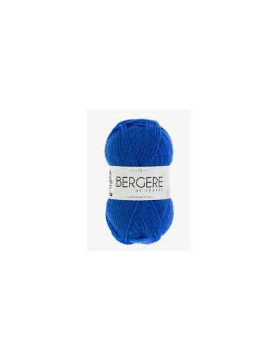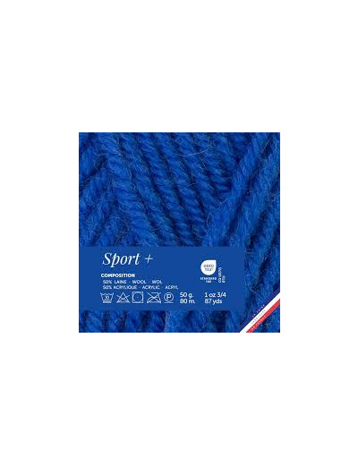 Pelote de laine Sport + couleur majorelle, en 50g, 50% laine, 50% acrylique, +/- 80m, se travaille en aiguilles et crochet n°5.