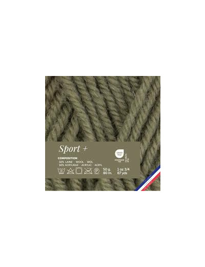 Pelote de laine sport + couleur Lichen, 50g, 50% laine, 50% acrylique, +/-80m, se travaille avec des aiguilles et crochet n°5.