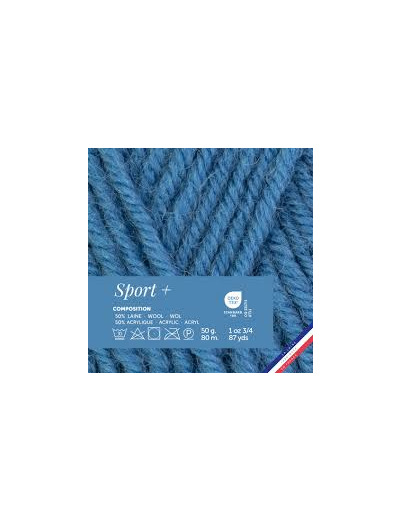 Pelote de laine sport + couleur Océan, 50g, 50% laine, 50% Acrylique, +/-80 m, se travaille en aiguilles et crochet n°5.