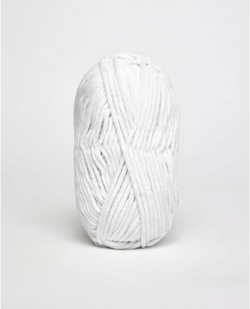 Pelote Pingo Chenille Blanc 100g, +/-107m, 100% polyester, se travaille en aiguilles et crochet n°6.