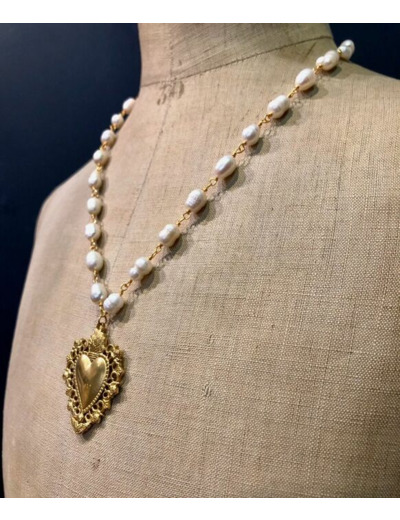 Le pendentif mesure environ 3 cm, il est plaqué or sur argent, et la chaîne mesure 45 cm et est composée de perles naturelles et d'acier inoxydable doré.