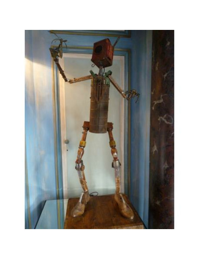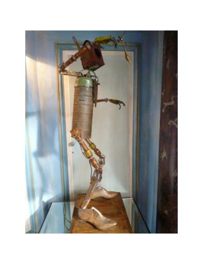 Un style très « steam punk » pour ce robot en bois, fabriqué à base d?objets anciens recyclés